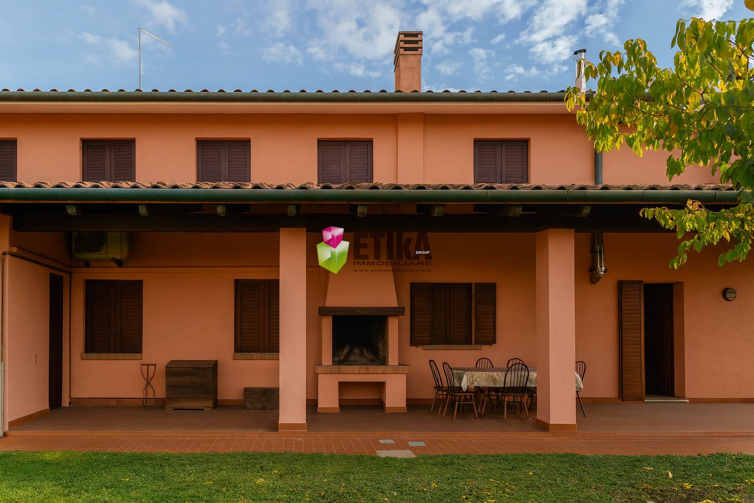 Fin dal primo passo nel lungo viale d’accesso, si percepisce l’accoglienza di un luogo pensato per vivere davvero, con spazio per le auto o per un camper, due garage e soprattutto spazio per le persone e i momenti che contano. Il grande portico coperto con caminetto invita a immaginare cene d’estate, risate sotto le travi e giornate lente godute all’aria aperta.
